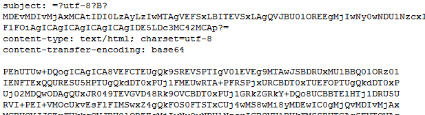 Daha önce söylediğimiz gibi SMTP, ASCII karakter seti aktarımına dayanıyor. 128 karakter haricinde kalan Türkçe karakterler gibi gelişmiş karakterlere yer yok. Bu yüzden içeriklerin 'encode' edilmeleri gerek. Yukarıdaki örnekteki 'quoted-printable ' kodlamasında 'Ç' harfi 'ç' gibi bir ifadeyle değiştiriliyor. Aşağıda ise base64 olarak kodlanmış bir mesaj görülüyor. Base64 binary verilerin de kodlanmasında kullanılan daha geniş olanaklara sahip bir kodlama sistemi. Fakat metin ağırlıklı mesajlarda verimsiz (%35-40 civarında boyut artışı) olduğu için tercih edilmez. Bir avantajıysa şifreli olmadığı halde gözle görüldüğünde içeriğin anlaşılamaması, dolayısıyla basit kullanıcılar tarafından okunamaması.